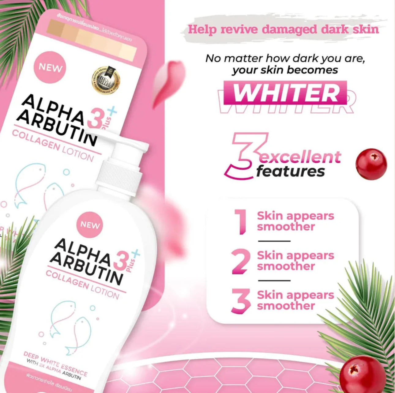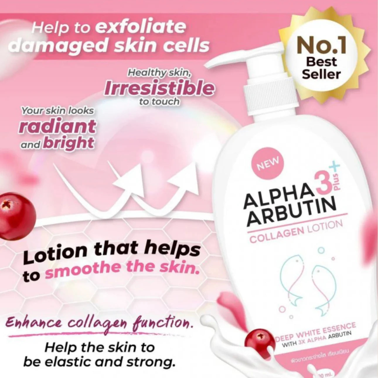 Alpha arbutin body lotion contains alpha-arbutin and glutathione effective active material and safe white pigment by mechanisms that inhibit tyrosine metabolism into melanocytes - pigment that causes the skin to brown - skin to be white and protected.