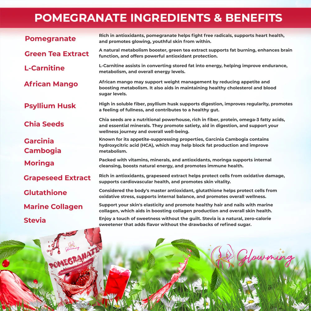 Glowming Shape Pomegranate Powder Drink Mix is a revitalising health and beauty drink formulated to help detoxify the body, support digestion, curb appetite, and deliver luminous skin. Infused with antioxidant‑rich pomegranate, glutathione, marine collagen, and other wellness ingredients, it combines beauty and wellbeing in every sachet.