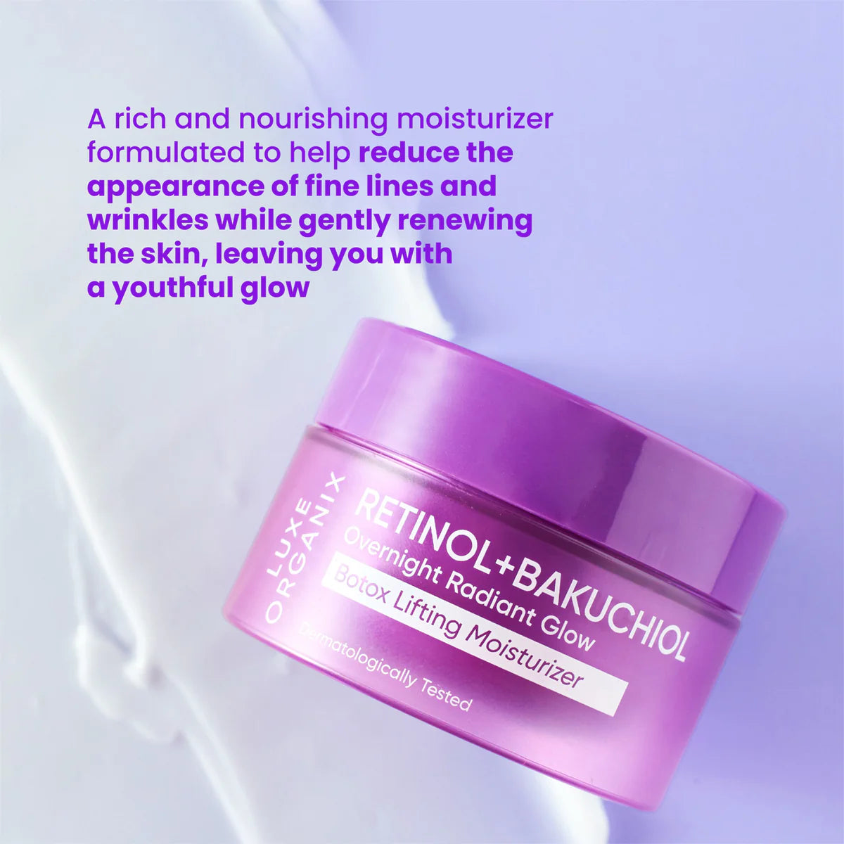 - Overnight Radiant Glow Botox Lifting Moisturizer: Infused with peptides, panthenol, and retinol to deeply nourish, lift, and restore your glow overnight.