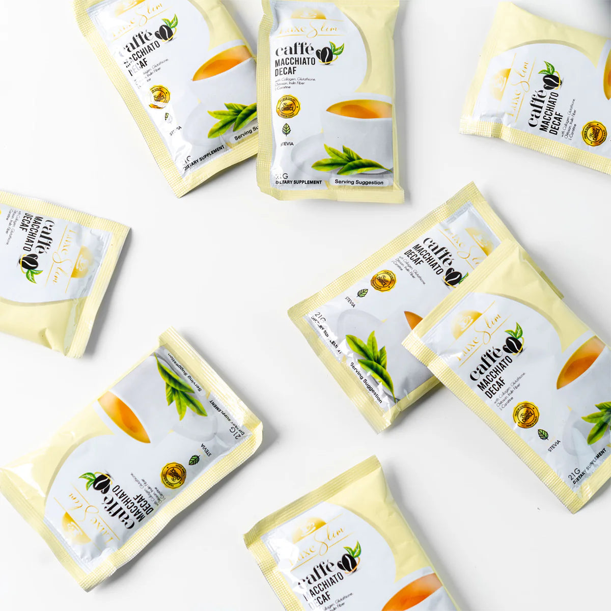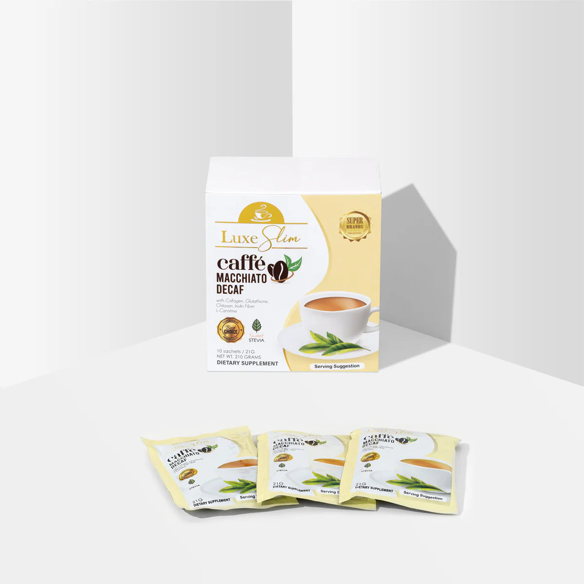 Luxe Slim Caffe Macchiato Decaf is a decaffeinated coffee blend infused with Collagen, Glutathione, and L-carnitine, aimed at enhancing skin radiance naturally. Collagen, known for its skin-firming properties, combines with Glutathione, a potent antioxidant, to promote a radiant complexion. Chitosan supports overall wellness, while inulin fiber aids digestive health, and L-carnitine contributes to energy metabolism.