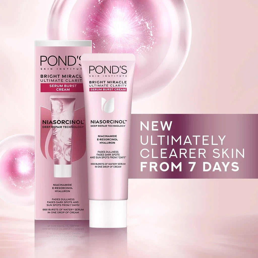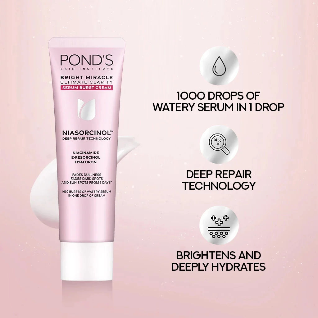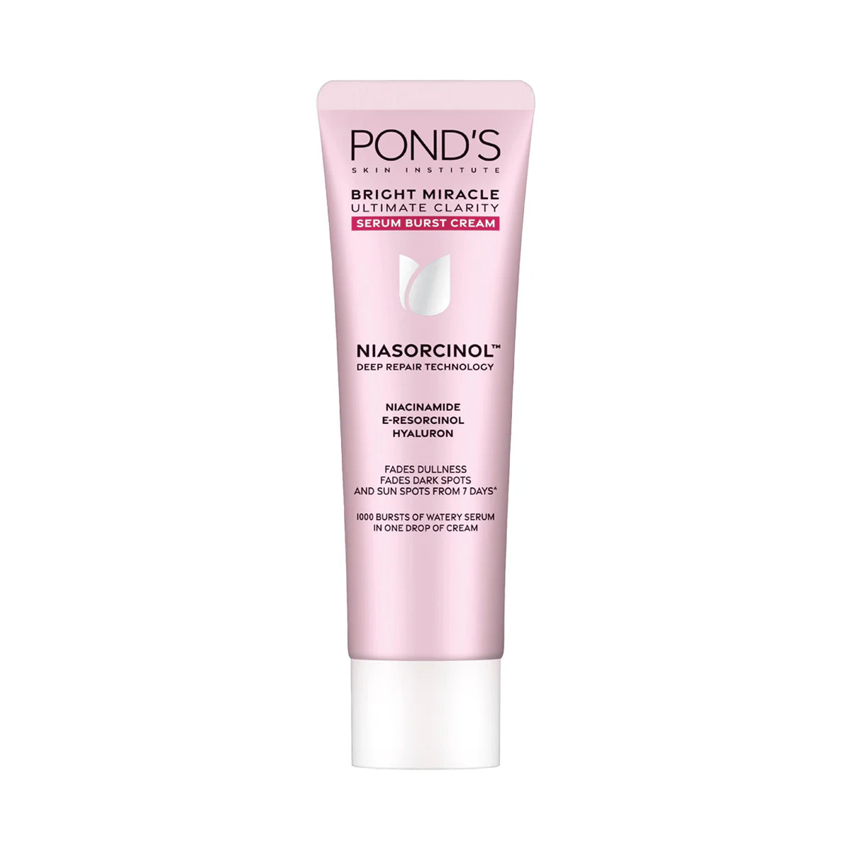 Experience the power of NIASORCINOL™, POND’S most advanced brightening technology, in the POND's Bright Miracle Serum Burst Cream. This lightweight day cream combines the potency of Niacinamide and E-Resorcinol to fade dark spots, acne marks, and dullness—delivering visibly clearer, more radiant skin in as little as 3 to 7 days. With over 1,000 serum droplets in every application, it hydrates deeply while repairing skin from within.