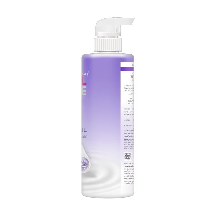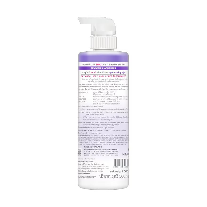 The SNAILWHITE Smooth & Youthful Body Wash is formulated with a blend of active ingredients designed to cleanse and nourish the skin. Key components include Niacinamide, known for its brightening and anti-inflammatory properties; Hydrolyzed Collagen, which helps improve skin elasticity; and Snail Secretion Filtrate, recognized for its moisturizing and regenerative effects. Additional ingredients such as Glycerin act as humectants to retain moisture, while Rosemary Leaf Extract provides antioxidant benefits. The formulation also includes surfactants like Sodium Laureth Sulfate and Cocamide Methyl MEA to effectively cleanse the skin. Preservatives like DMDM Hydantoin and Sodium Benzoate ensure product stability, and Fragrance (Alive Vive) adds a pleasant scent. The product is manufactured in Thailand and is available in a 500 mL bottle.