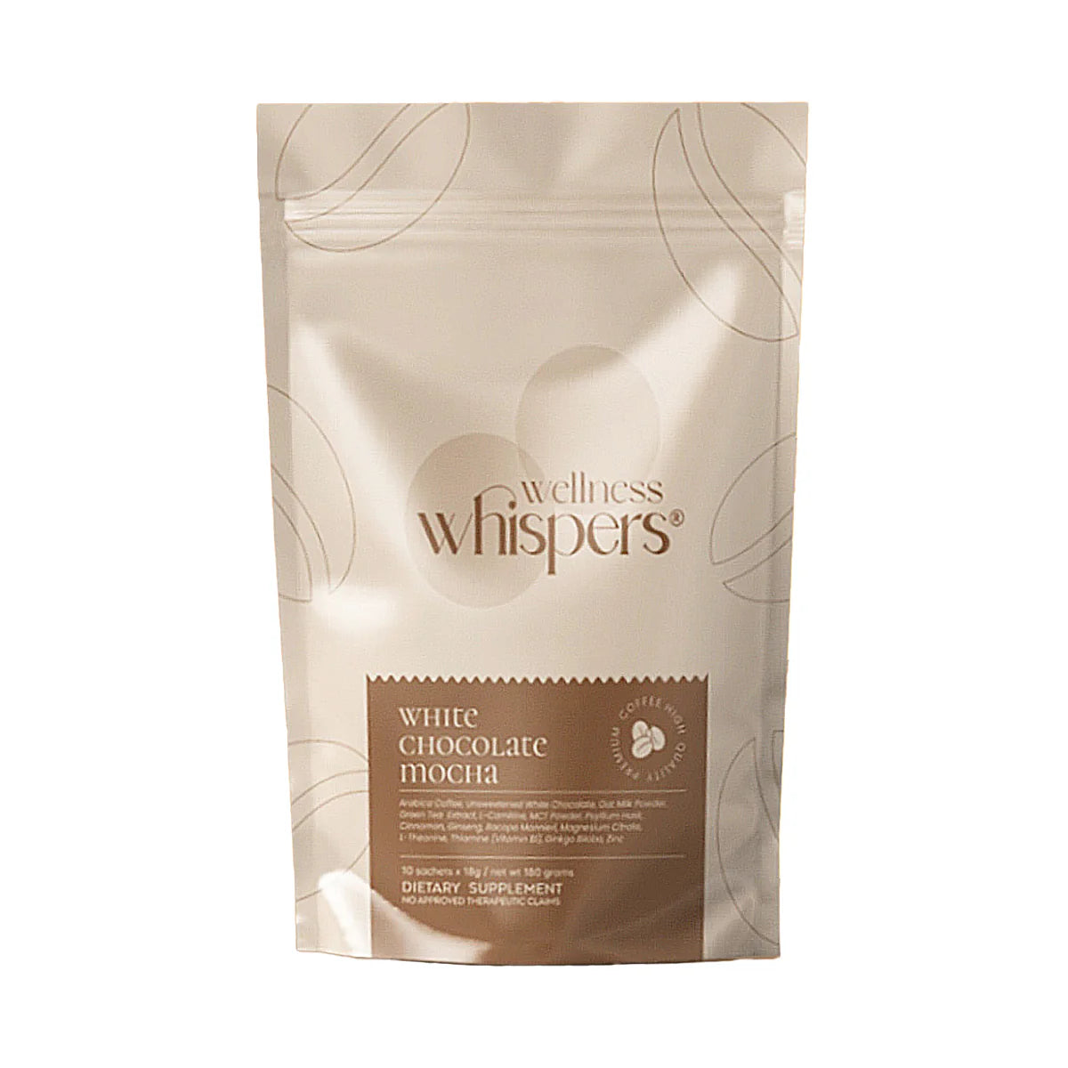 Discover Wellness Whispers White Chocolate Mocha, a Halal-certified Filipino wellness coffee blend crafted for holistic well-being. This creamy, delicious mix of rich Arabica coffee and unsweetened white chocolate offers: